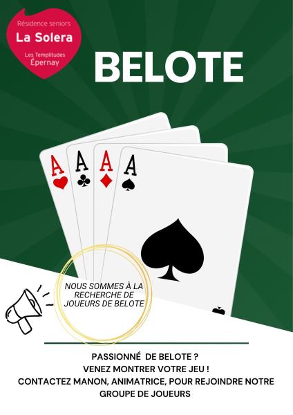 Les Templitudes "La Solera" > Actualités > Belote Belote Publiée le 23/10/2025 Nous recherchons des joueurs de belote ! Si vous savez jouer, contactez Manon, notre animatrice.