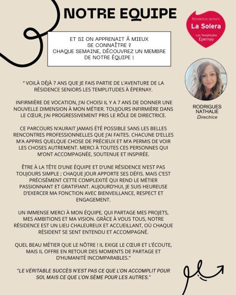 Aujourd’hui, coup de projecteur sur l’un des membres de notre équipe : Mme Rodrigues Nathalie Directrice de la résidence.