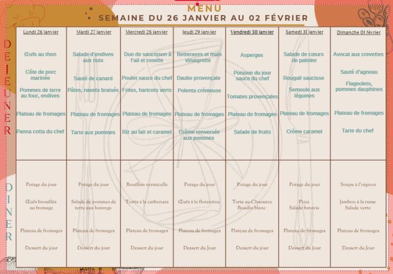 Les Templitudes "La Solera" > Actualités > Menu du 26/01 au 01/02 Menu du 26/01 au 01/02 Publiée le 24/01/2026 Menu du 26/01 au 01/02