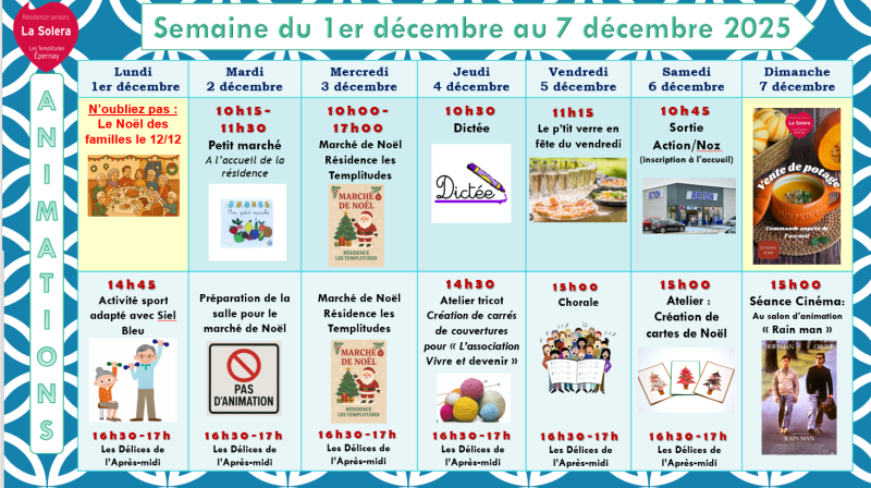Les Templitudes "La Solera" > Actualités > Planning des animations du 01 au 07/12 Planning des animations du 01 au 07/12 Publiée le 29/11/2025 Planning des animations du 01 au 007/12