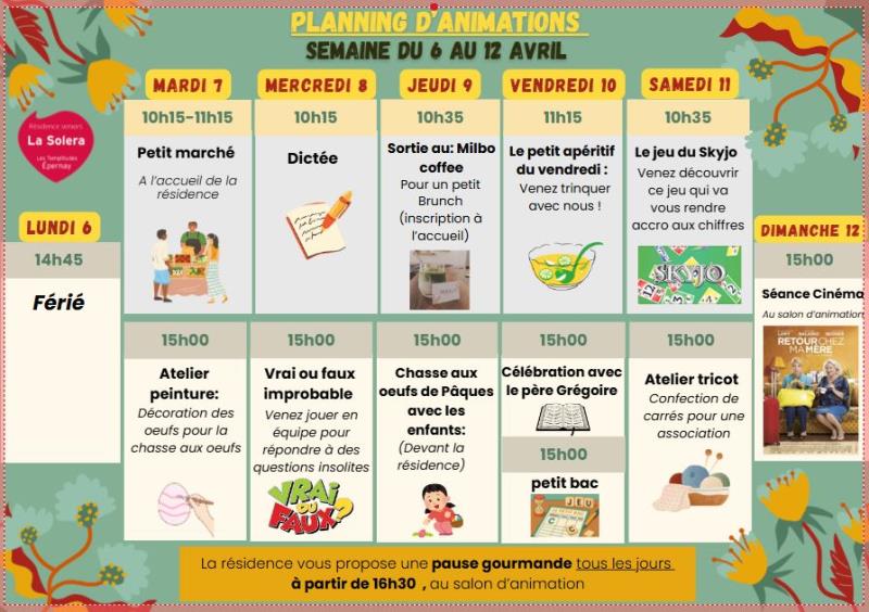 Les Templitudes "La Solera" > Actualités > Planning des animations du 06 au 12/04 Planning des animations du 06 au 12/04 Publiée le 04/04/2026 Planning des animations du 06 au 12/04