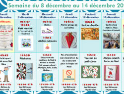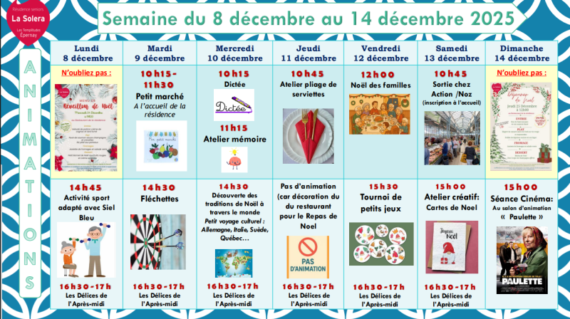 Les Templitudes "La Solera" > Actualités > Planning des animations du 08 au 14/12 Planning des animations du 08 au 14/12 Publiée le 06/12/2025 Planning des animations du 08 au 14/12