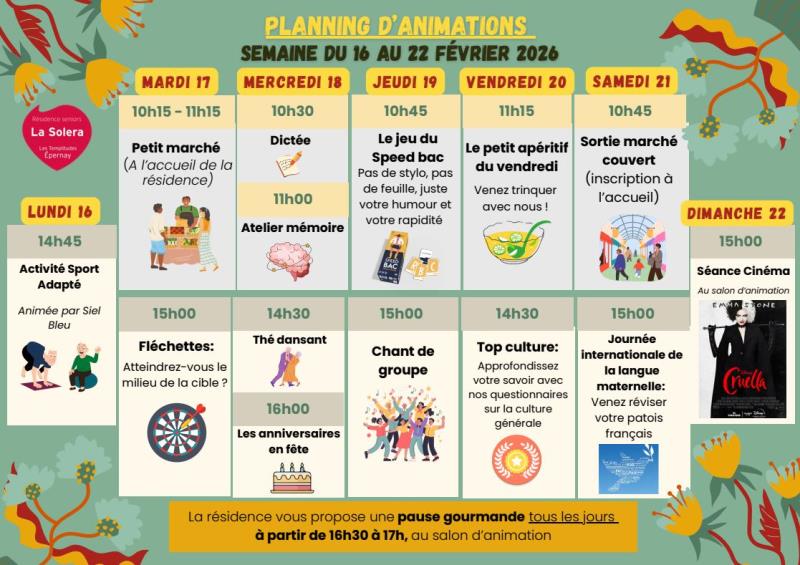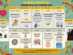 Les Templitudes "La Solera" > Actualités > Planning des animations du 16 au 22/02 Planning des animations du 16 au 22/02 Publiée le 14/02/2026 Planning des animations du 16 au 22/02