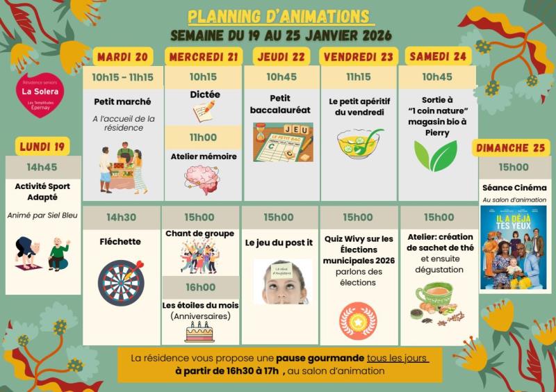 Les Templitudes "La Solera" > Actualités > Planning des animations du 19 au 25/01 Planning des animations du 19 au 25/01 Publiée le 17/01/2026 Planning des animations du 19 au 25/01