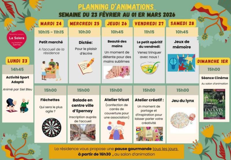 Les Templitudes "La Solera" > Actualités > planning des animations du 23/02 au 01/03 planning des animations du 23/02 au 01/03 Publiée le 21/02/2026 Planning des animations du 23/02 au 01/03