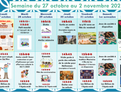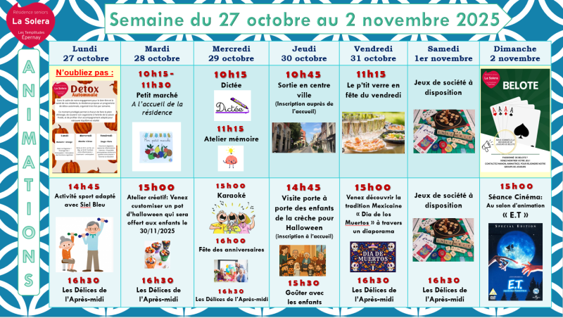 Les Templitudes "La Solera" > Actualités > Planning des animations du 27/10 au 02/11 Planning des animations du 27/10 au 02/11 Publiée le 24/10/2025 Planning des animations du 27/10 au 02/11