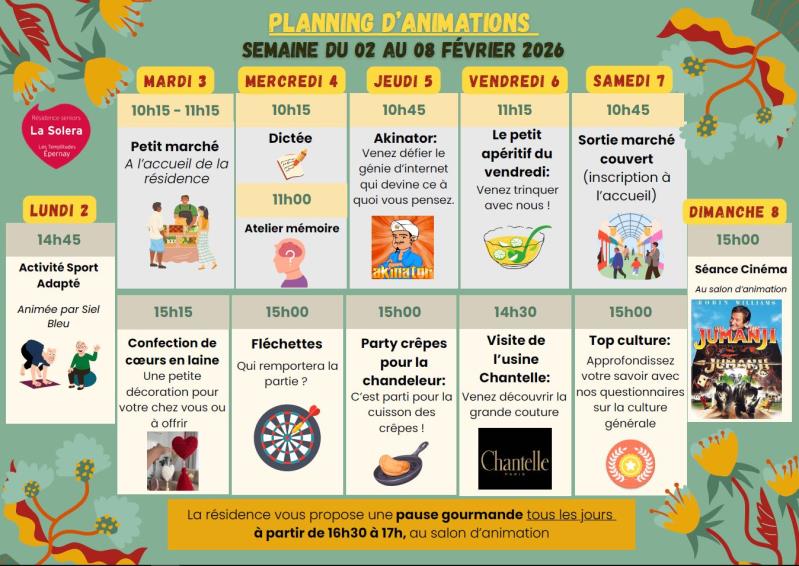 Les Templitudes "La Solera" > Actualités > Planning du 02 au 08/02 Planning du 02 au 08/02 Publiée le 31/01/2026 Planning du 02 au 08/02