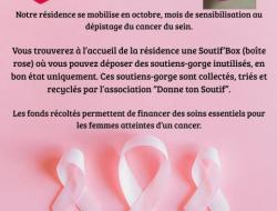 Vous trouverez à l’accueil de la résidence une Soutif’Box (boîte rose) où vous pouvez déposer des soutiens-gorge inutilisés, en bon état uniquement. Ces soutiens-gorge sont collectés, triés et recyclés par l’association Donne ton Soutien.
